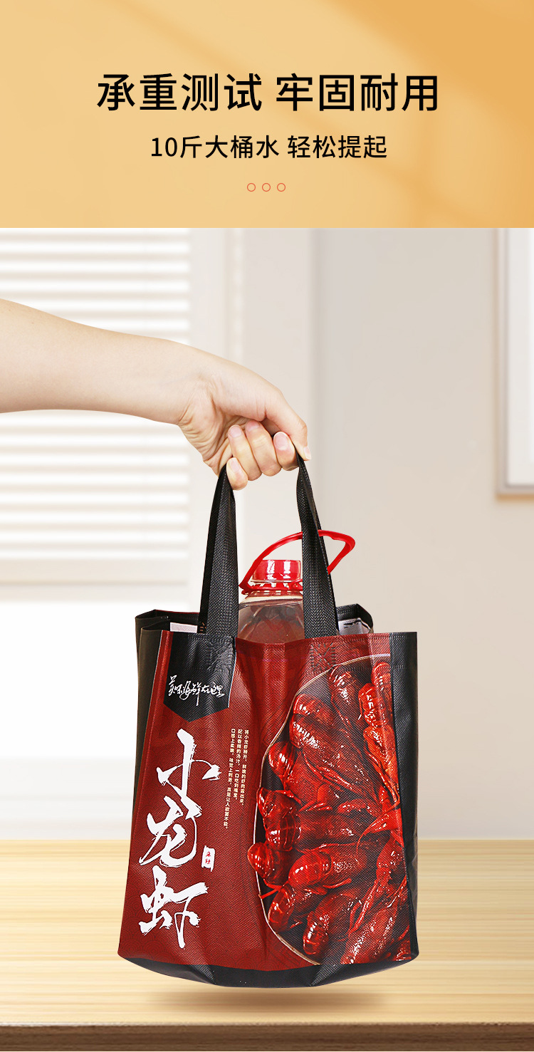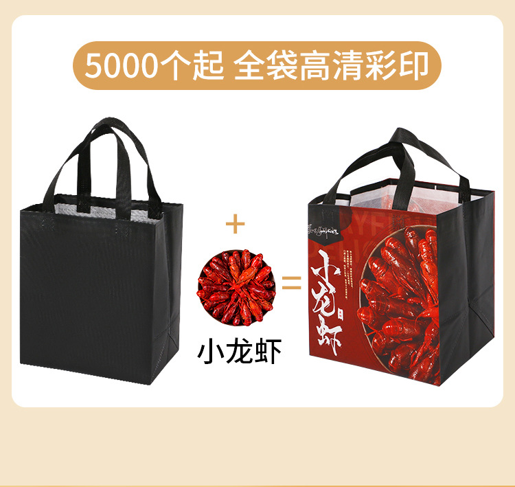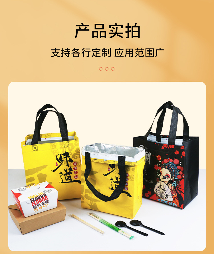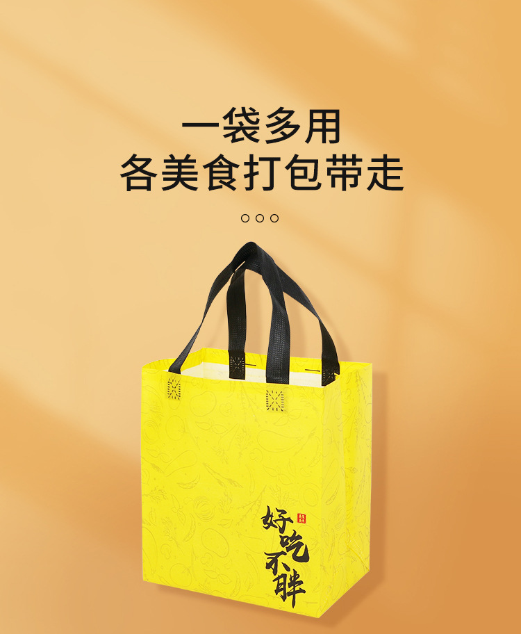 • 广告宣传:无纺布覆膜外卖袋可以作为商家的广告宣传工具,客户可以在袋子上印上自己的品牌LOGO或宣传语,增加品牌曝光率。
