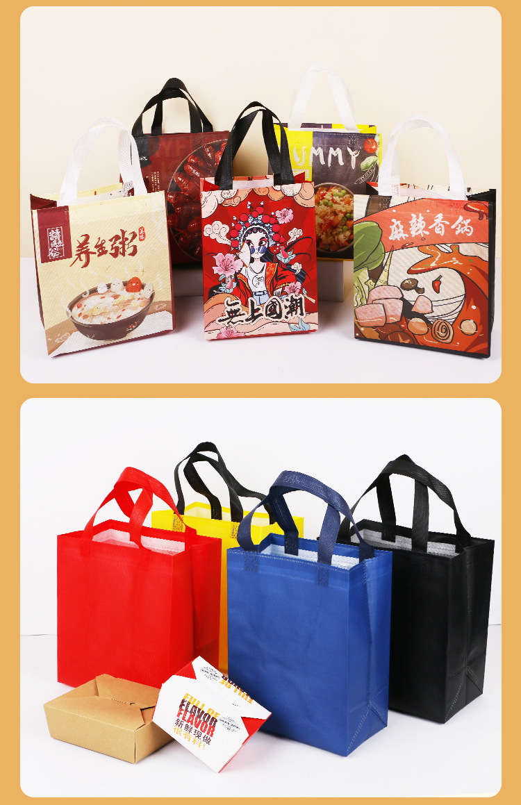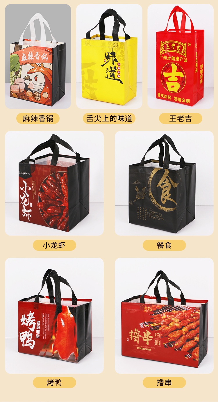 • 环保性:无纺布覆膜外卖袋是一种环保产品,客户在选择材质和设计时,应考虑到环保因素,尽可能选择可回收、可降解的材料。